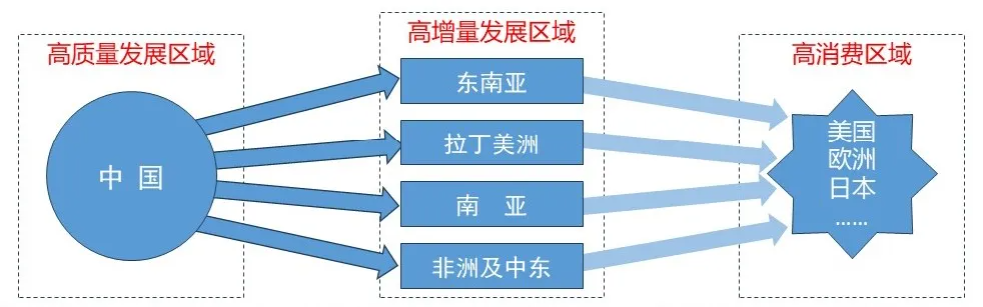 全球制造业正在分化为三个区域。第一个是高质量发展区域,这个区域只包含中国。第二个区域是高增量发展区域,包括四大黑马,即东南亚、拉丁美洲、南亚、非洲中东中亚。第三个是高消费区域,包括美、欧、日等发达国家。高增量发展区域将向高消费区域输出物美价廉的低端消费品,中国的主要作用不再是向外输出物美价廉的低端消费品,而是成为全球制造业的主引擎和产业创新的主战场,有序地输出先进的、高质量的产品、装备、技术、市场和生态资源,从而引领全球制造业的发展。