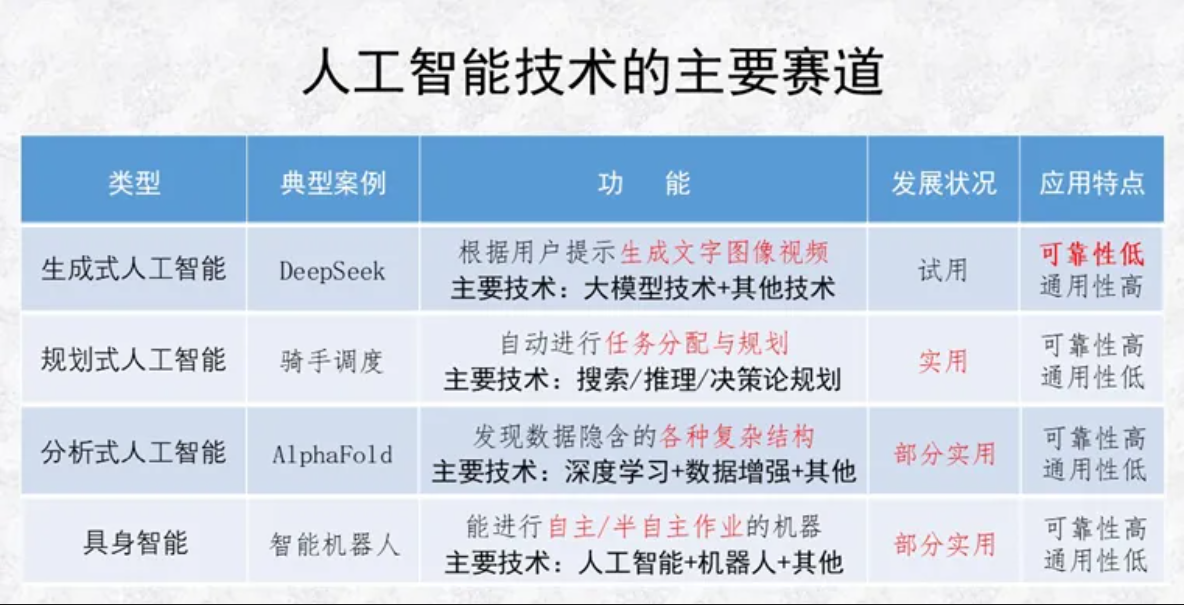 由此可知,我国需要很多种人工智能技术,而不局限于其中的某一种。实际上,人工智能技术至少有四条主要赛道,如图1所示。其中大家都知道的,是生成式人工智能,主要包括大模型和多模态大模型。然而除此之外还有另外三条主要赛道,下面逐一加以介绍。