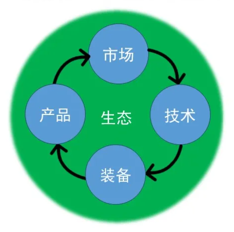 传统制造业的产业创新的最大挑战是什么?我发现了一个过去被忽视的关键因素——传统制造业的“五位一体”创新闭环,也就是市场、技术、装备、产品四个主要部门,再加上生态(除市场、技术、装备、产品之外的其他一切要素,如科技、教育、文化等等),共同形成的一个闭环(如图2所示)。这个闭环之所以重要,因为它是制造业创新的土壤,只有在这个土壤上,产业创新才可以开花结果。